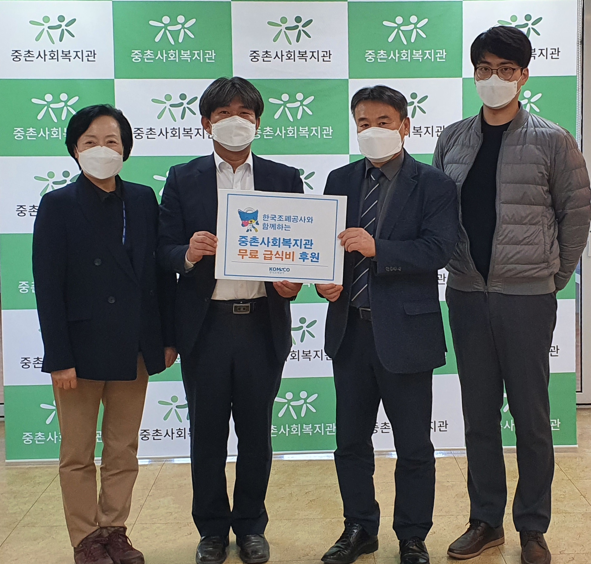 조폐공사가 대전 중촌사회복지관에 소외계층 무료 급식을 위한 기부금 100만원을 전달했습니다! 중촌사회복지관은 최근 코로나19 바이러스 확산 위험을 방지하기 위해 무료급식소 운영을 중단하고 인근 소외계층 가구에 도시락을 제공하고 있는데요.
