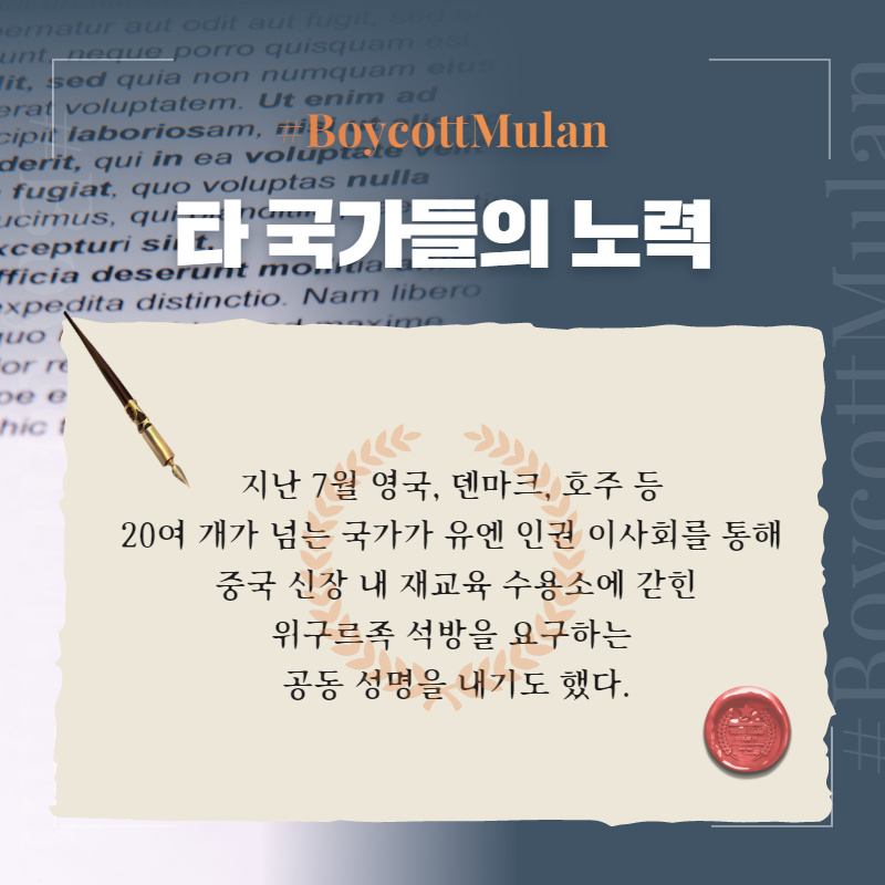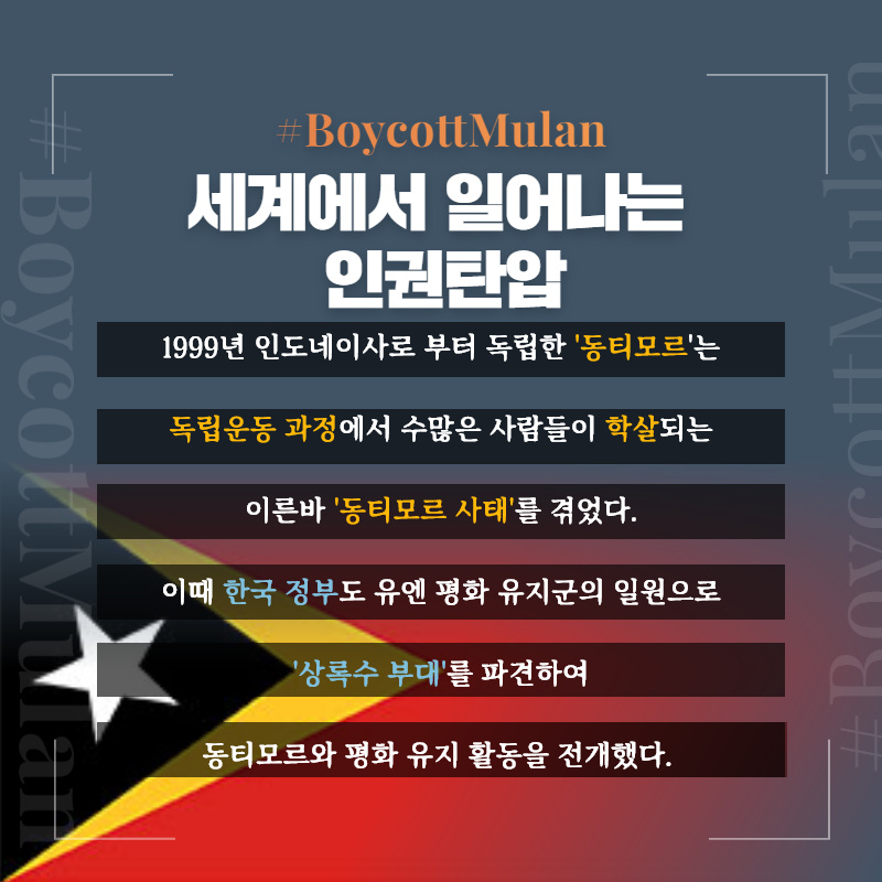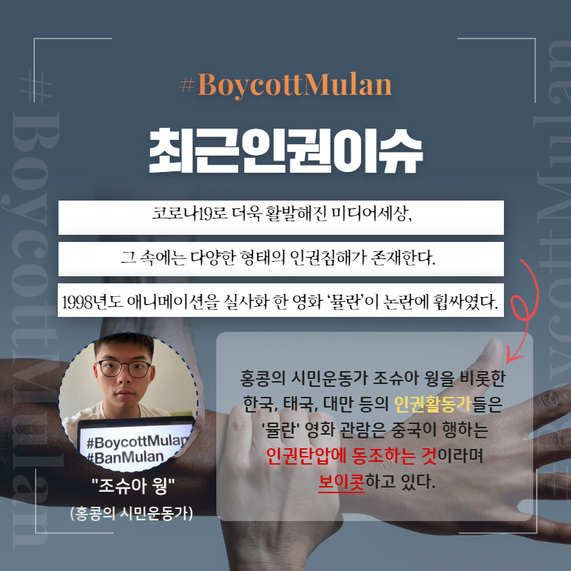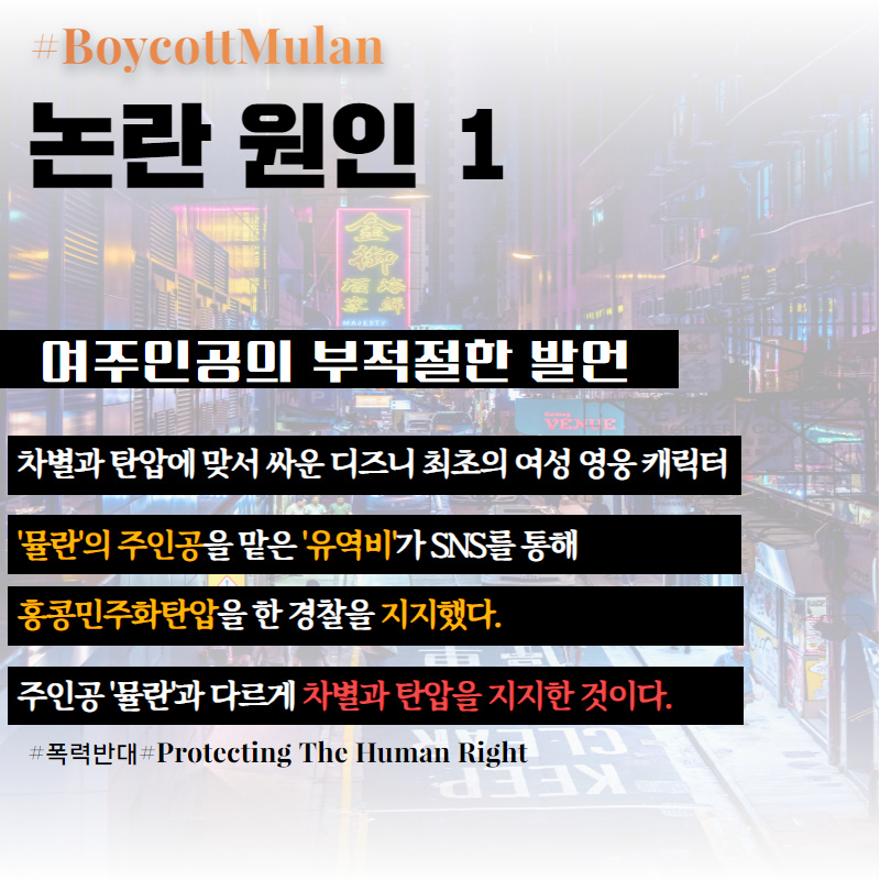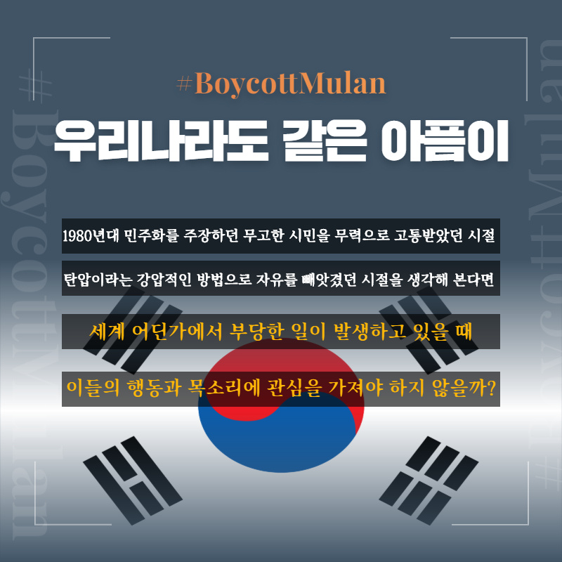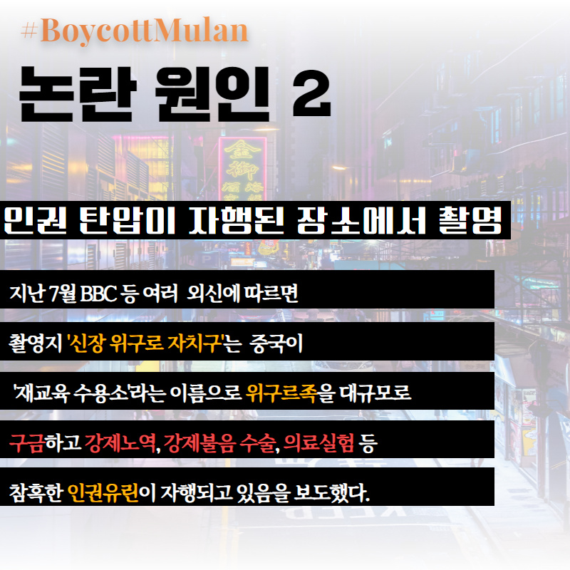 디즈니에서 야심차게 만든 뮬란에 인권침해 요소가 발견됨에 따라 #보이콧뮬란 논란이 가속화되고 있습니다.