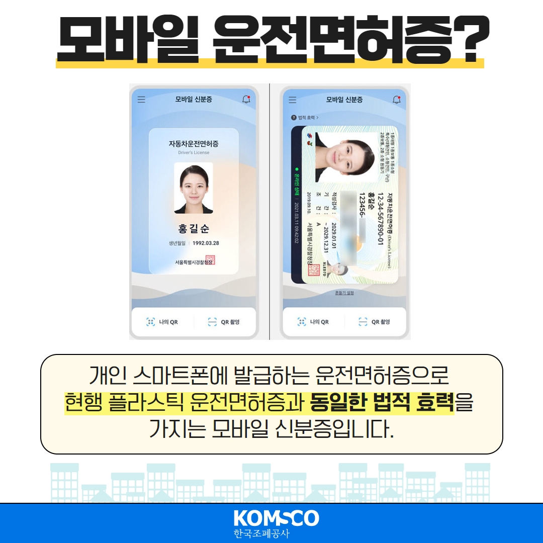 현행 플라스틱 운전면허증과 동일한 법적 효력을 가지는 모바일 신분증입니다.