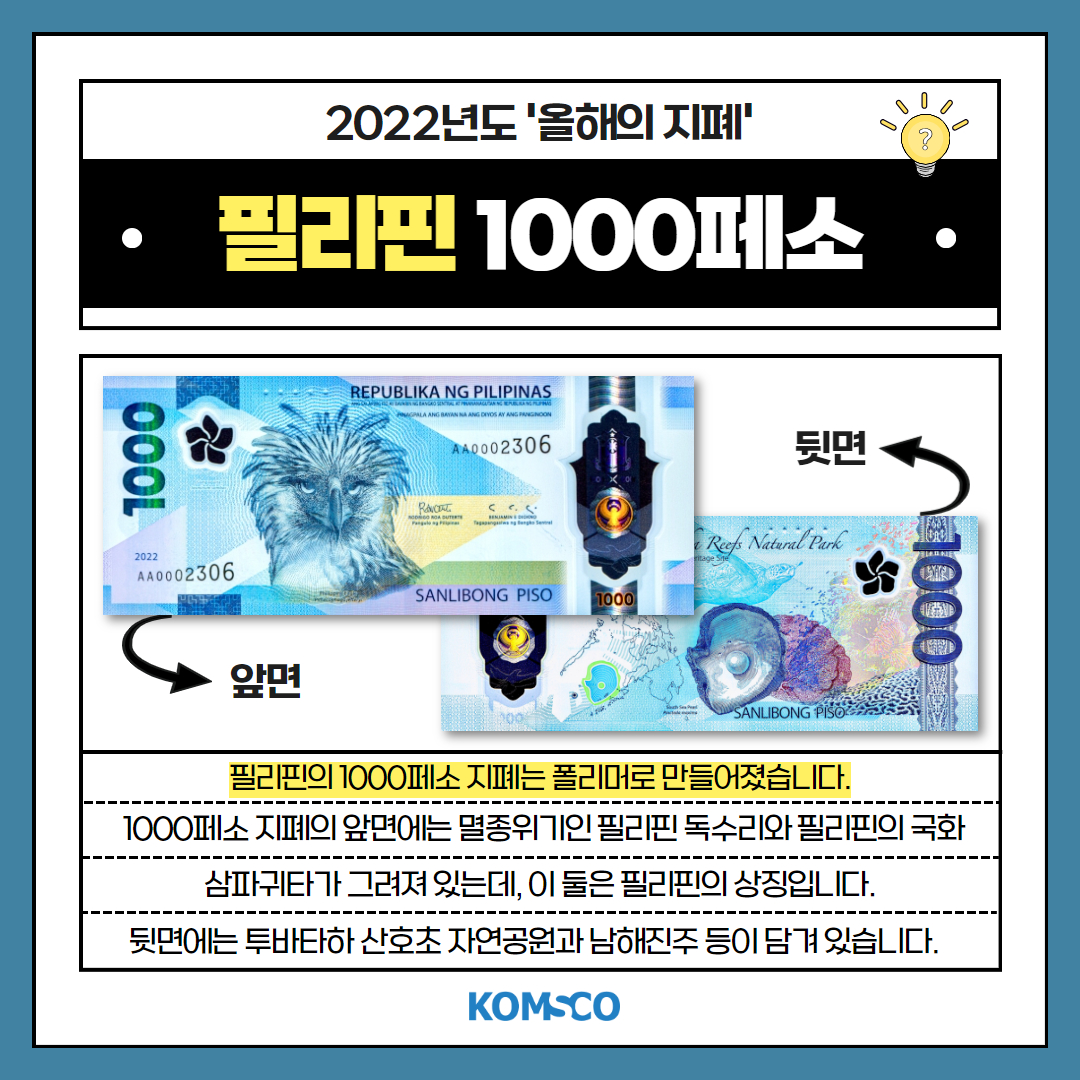 1000페소 지폐의 앞면에는 멸종위기인 필리핀 독수리와 필리핀의 국화 삼파귀타가 그려져 있는데,